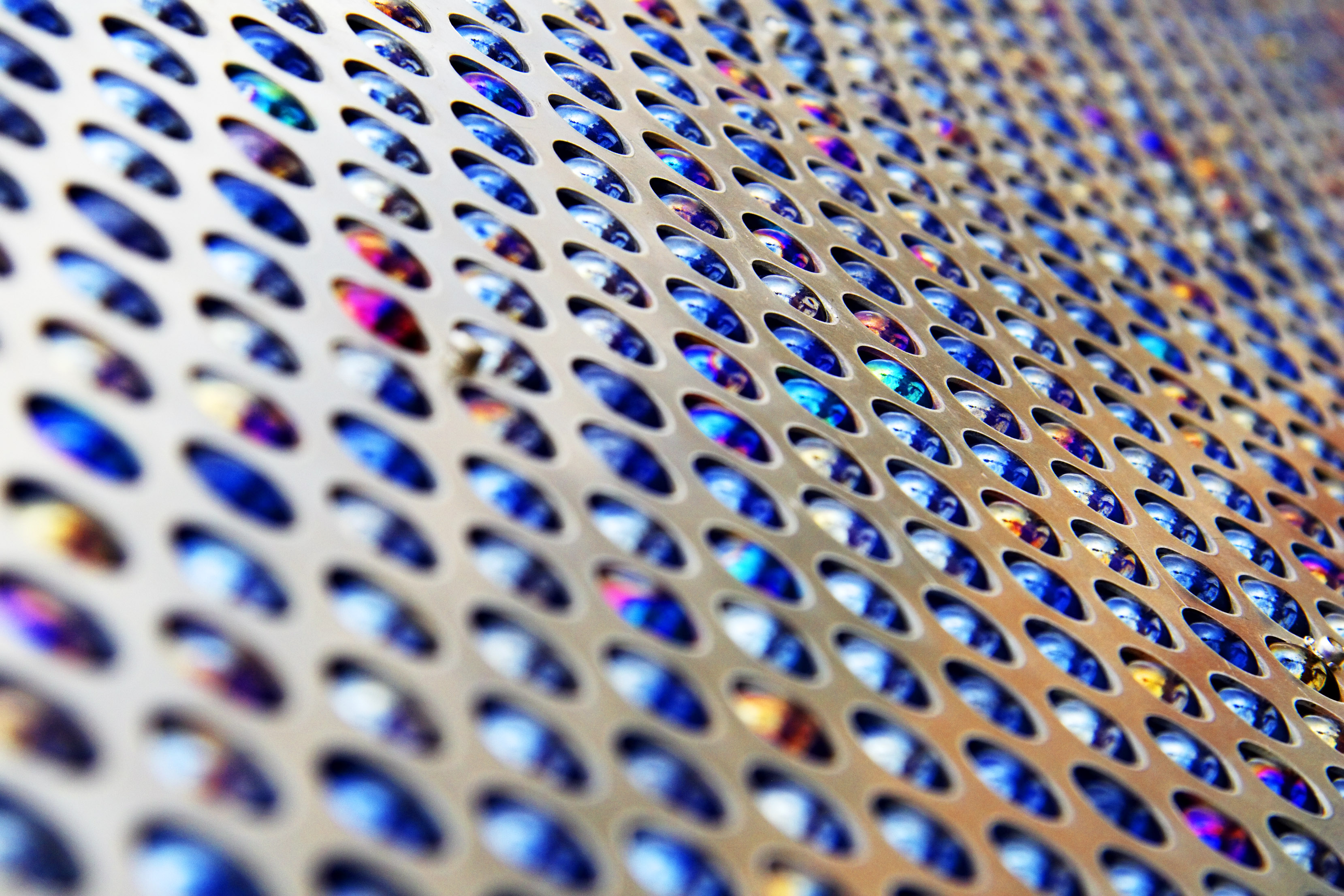 Metal grid fill with colored glass spheres.
