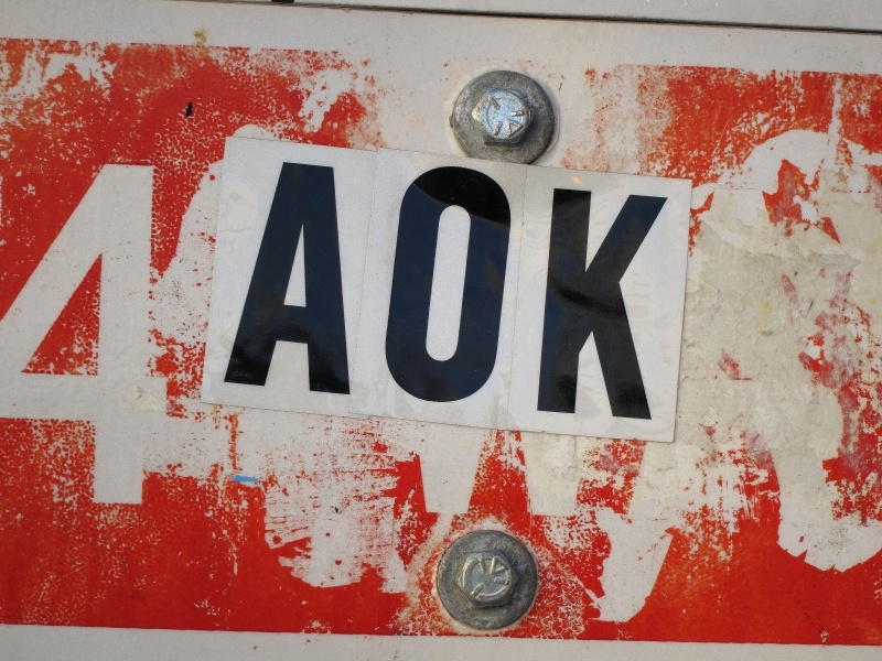 an aok sign posted on a metal stop sign