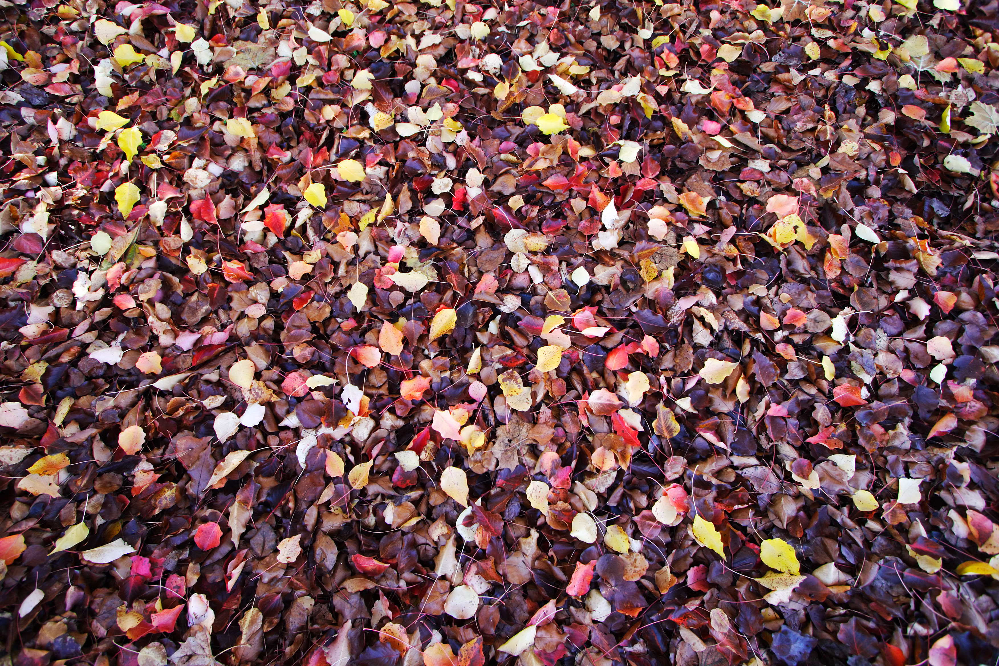 A blanket of autumn leaves on the ground, Many colors of wet fall colors.