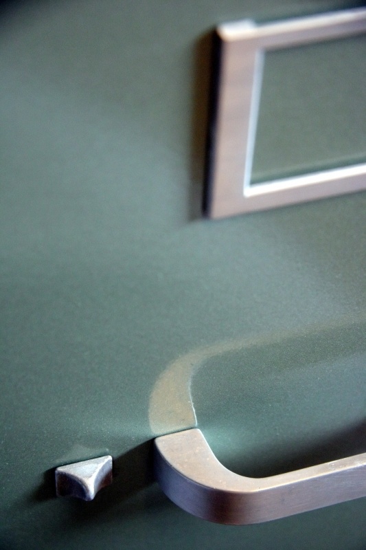 The handle and lock lever of a green office upright filing cabinet.